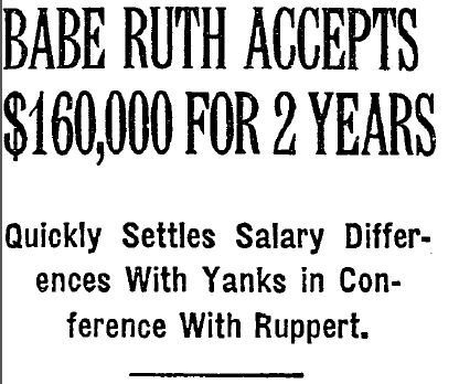 In 1930, Babe Ruth negotiated a two-year contract with the Yankees for $160,000. (That’s about $2.2 million in 2016 dollars.)