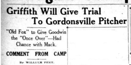 So he did. He became known around Virginia for his “perfectly controlled” spitball, and in 1916 a local scout convinced Clark Griffith, manager of the Washington Nationals, to give Goodwin a look. So Goodwin went down to Charlottesville, where Griffith and his Nationals were training.