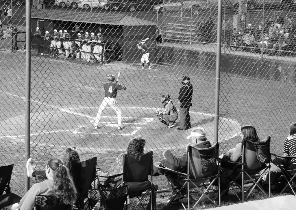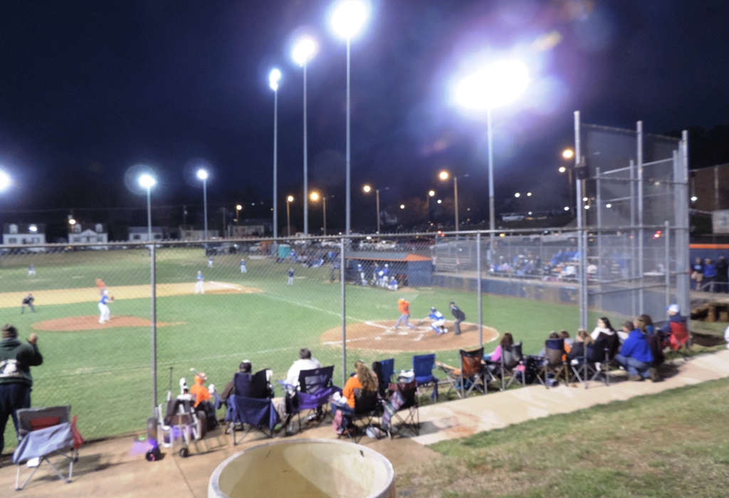 We have a decent high school stadium for baseball here. It even has ivy (or something like ivy) growing on the outfield walls. It’s pretty dreary this time of year, but by late April adds a touch of class to the field. There are 2 dugouts, but only one clubhouse, so the visitors dress at home (or on the bus maybe). I presume the bus smells bad on the way home. Of course it smells a little bit better if they won. There are 2 coaches, one at third base and one in the dugout to keep the batting order in line and to keep the kids also in line. A player coaches first base and as a rule has no idea how. The concession stand is overpriced and the soda is warm (no beer on school property). The fans root for their own kids and few of them know how the game is played at the “inside baseball” level (Hey, this is football country). But they’re enjoying the game.