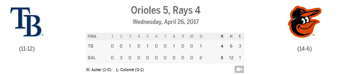 The Baltimore Orioles beat the Tampa Bay Rays last night, 5-4 in 11.