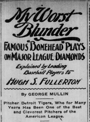But, you can find Hugh Fullerton’s “My Worst Blunder” syndicated column, which was a regular piece in many newspapers, where big leaguers share their worst career play. Wouldn’t you know it, the July 5 blunderer? George Mullin.