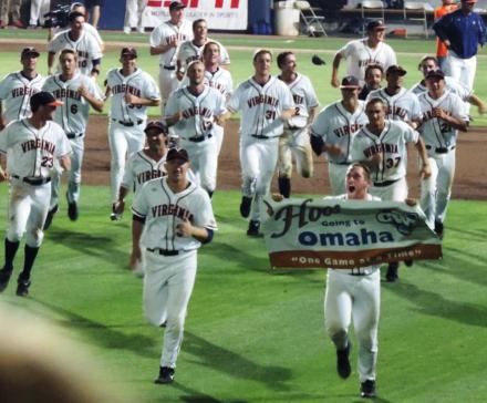 Artie Lewicki, front/left, leads the Virginia celebration with the fans following their win over Maryland in the 2014 Super Regionals, which sent them to the College World Series.