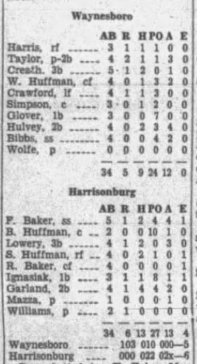 Harrisonburg, with Baker and Huffman, won two championships in 1936 – the VBL championship, defeating Culpeper, and the Augusta-Rockingham League championship, defeating Waynesboro.