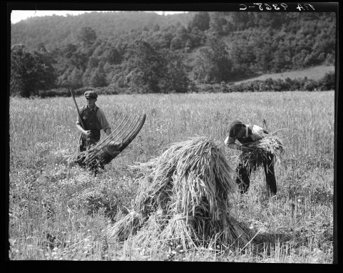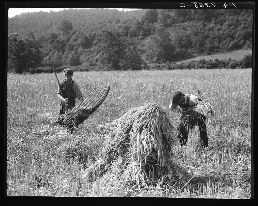 Boys harvesting wheat by hand near Sperryville, Virginia in the 1930s. They told photographer Dorthea Lange they had never seen a mechanical combine harvester. (Floyd Baker’s family farm was likely near this one.)
