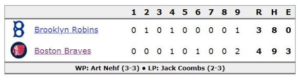 But, on May 8, 1918, the Braves won, defeating the Brooklyn Robins (today’s Dodgers) 4-3.