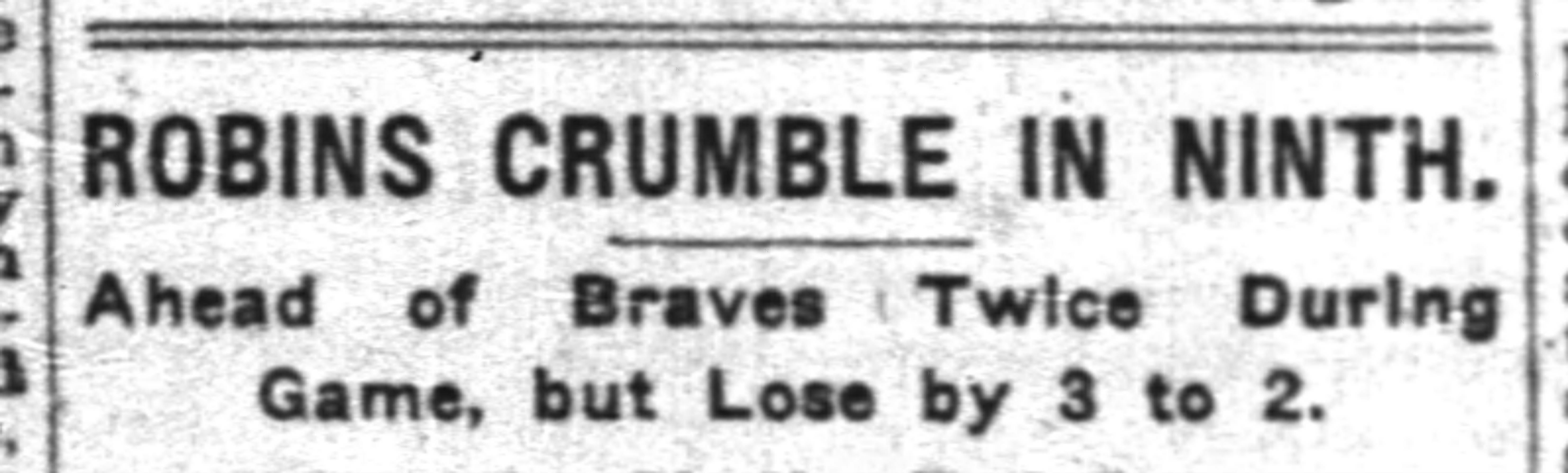 But, on May 8, 1918, the Braves won, defeating the Brooklyn Robins (today’s Dodgers) 4-3.