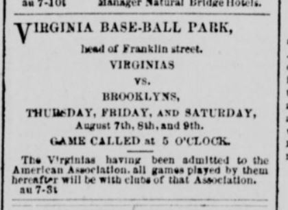 But, just for the record, I can tell you this. Its past includes baseball. And, for 10 weeks in 1884, Richmond had a big league team.