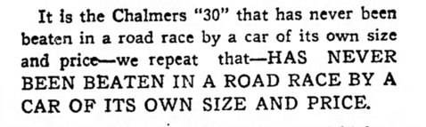 Chalmers loved to remind you — in ALL CAPS — that their cars had “never been beaten.” A Chalmers, they said, could go “one mile in one minute.”