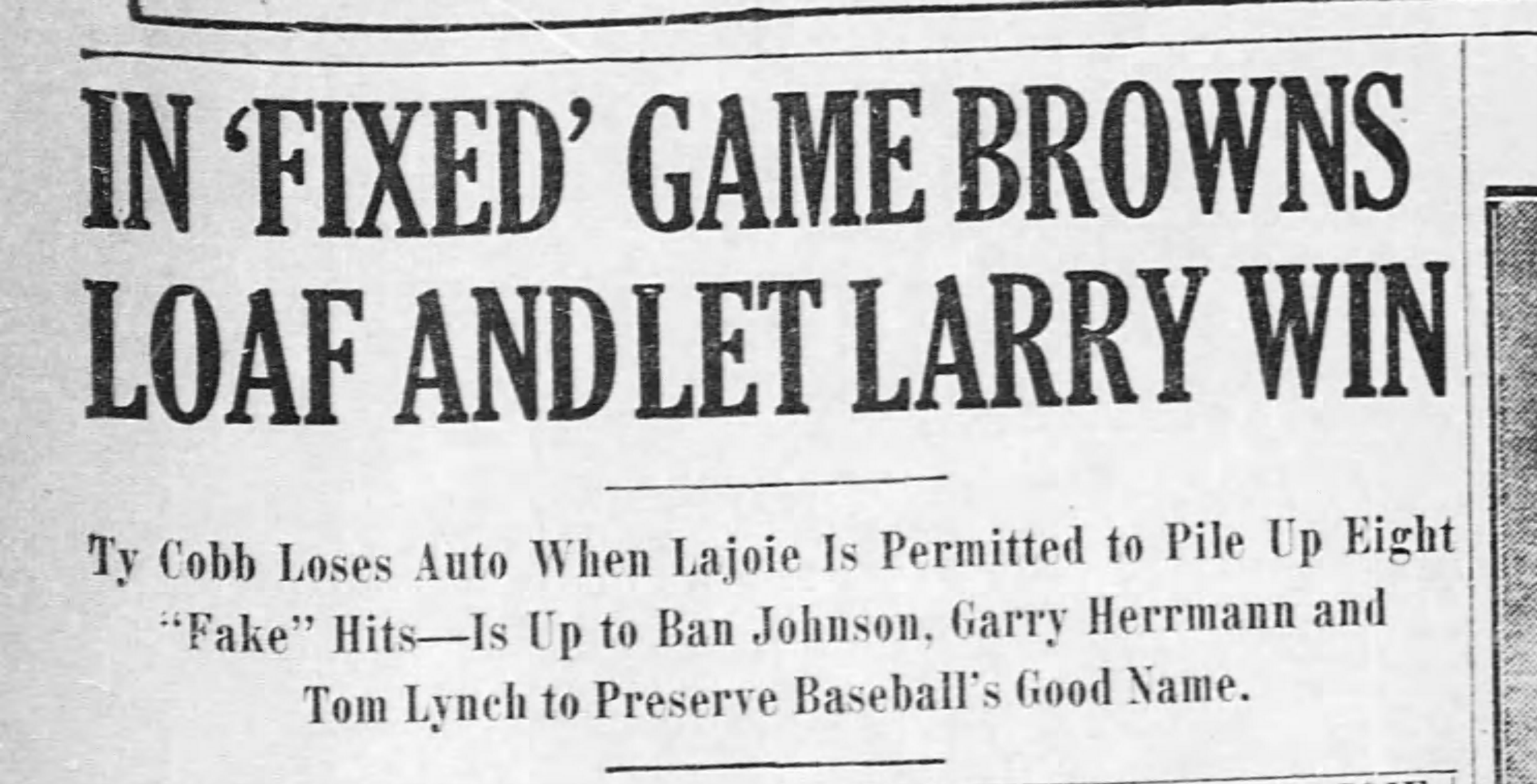 “The action of Corriden at third is susceptible of two explanations. He is either the worst third baseman in the world or he was party to a conspiracy to aid Lajoie.” — The St. Louis Post Dispatch. 10/10/1910.