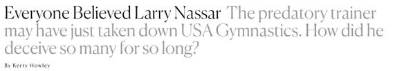 “It has by the fall of 2018 become commonplace to describe the 499 known victims of Larry Nassar as ‘breaking their silence,’ though in fact they were never, as a group, particularly silent. Over the course of at least 20 years of consistent abuse, women and girls reported to every proximate authority. They told their parents. They told gymnastics coaches, running coaches, softball coaches. They told Michigan State University police and Meridian Township police. They told physicians and psychologists. They told university administrators. They told, repeatedly, USA Gymnastics. They told one another. Athletes were interviewed, reports were written up, charges recommended. The story of Larry Nassar is not a story of silence. The story of Larry Nassar is that of an edifice of trust so resilient, so impermeable to common sense, that it endured for decades against the allegations of so many women.”