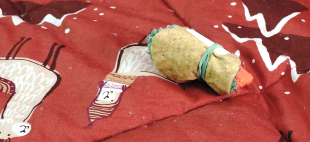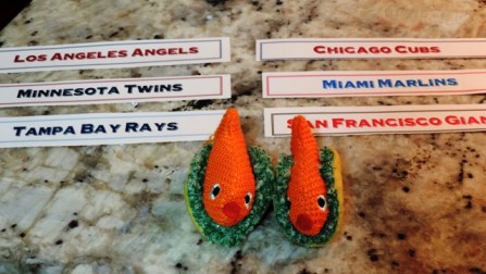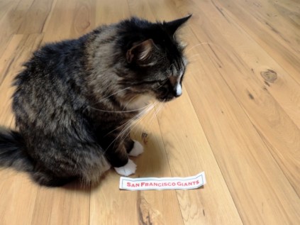 Without peeking, Editor/Husband chose one American League team and one National League team, and I carefully wrapped their names – still hidden – around two adorable fish taco cat toys and placed them on a blanket.