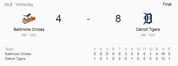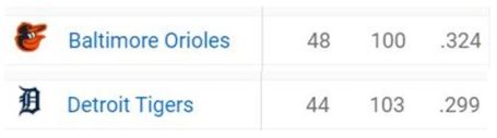 Someone on Twitter noticed that today’s game – Baltimore Orioles at the Detroit Tigers – will mark the first time in American League history that two teams with 100 or more losses each will play each other.