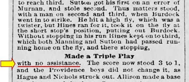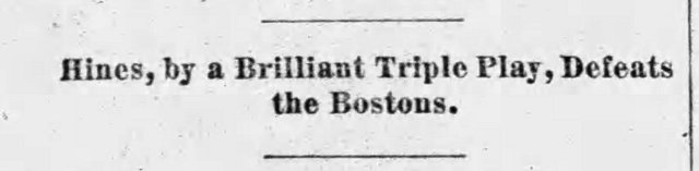 “Without stopping in his run Hines kept on to third, which both Manning and Sutton had passed running home on the fly, and there stopping, Made a Triple Play with no assistance.”