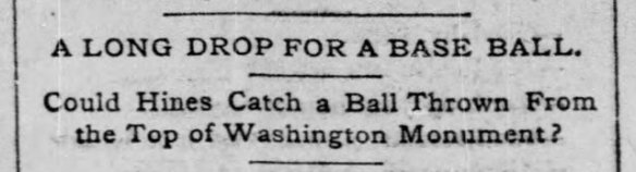 In December 1884, Hines makes news when he attempts to win $100 by catching a baseball dropped from 585 feet up the Washington Monument. He later reports that he missed three chances that day, and that the new white baseballs they used were hard to see against the white of the monument. He got a hand on just one of the balls, which brushed against his bare fingers. It was moving so hard and fast it left a dent when it hit the frozen ground.