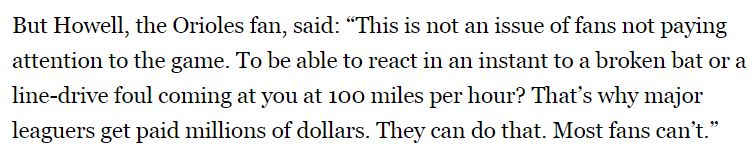 Me? I’m tired of the argument that a fan wouldn’t be hurt if only they were paying attention to the game and not looking at their cell phone. That six year old should have caught that screaming line drive foul? Just reach out your hand and grab that spinning shard of bat before it hits you in the face?