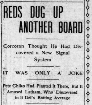 Chile’s jittery leg found him out. On September 20, 1900, the suspicious Cincinnati Reds dug up the buzzer buried in the coaching box. (The next day Chiles, as a joke, buried a non-working buzzer in the first base coaching box, which the Reds also eventually dug up. You gotta admit, that’s sort of funny.)