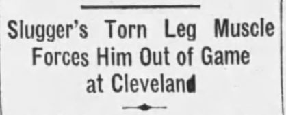 Ruth needed that day off and then some. In a game in Detroit, he collapsed while chasing a ball in the 7th inning of a Yankees loss and teammates had to carry him off the field. His injury – a sprained left knee, pulled leg muscle, torn groin muscle, torn knee muscle – depended on what paper you were reading.