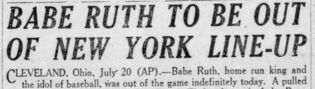 Ruth’s in the line-up against Cleveland the next day, July 19 – the first game of a doubleheader. He walks in the first inning, but hobbles badly to second on a Tony Lazzeri single, and is pulled from the game.