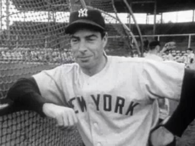 This game is historic because on this date, in this very game, this horrible, embarrassing shmooshment of the Yankees, center fielder Joe DiMaggio got a hit.