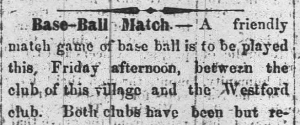 It’s on May 29, 1868 in their little four-page weekly Fox Lake Representative that I found this notice for a game to be played between the Fox Lake team and the team from neighboring Westford that afternoon.