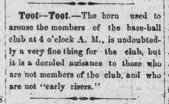 Toot-Toot. The horn used to arouse the members of the base-ball club at 4 o’clock A.M., is undoubtedly a very fine thing for the club, but it is a decided nuisance to those who are not members of the club, and who are not “early risers.”