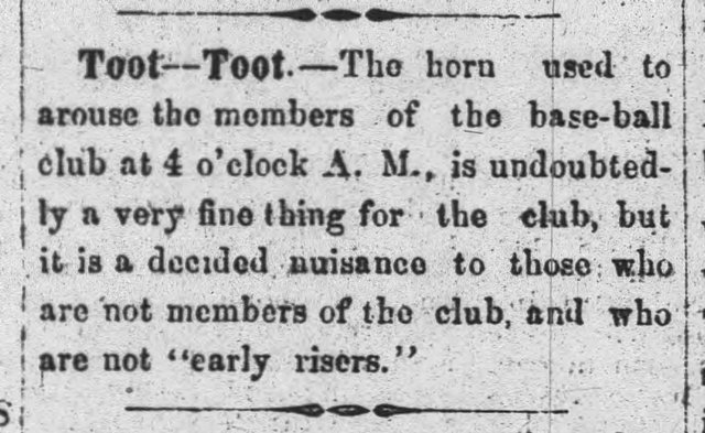 Toot-Toot. The horn used to arouse the members of the base-ball club at 4 o’clock A.M., is undoubtedly a very fine thing for the club, but it is a decided nuisance to those who are not members of the club, and who are not “early risers.”