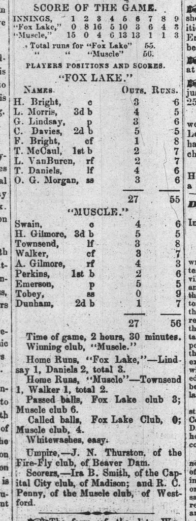 Yeh, 19th century box scores are odd … and every scorer recorded things differently. (When I first started reading them it took me awhile to discover that while today we consistently give the visiting team line first then the home team, back then the losing team was always the top line — which explains why Fox Lake, the home team, is listed first.)