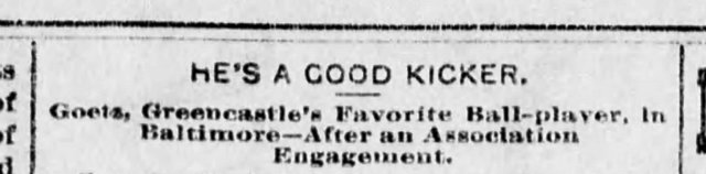 By 1889, Goetz, 23, has become Greencastle’s baseball phenom – known for a pitch that is something like a curveball. He’s found some success with a Roanoke, Virginia team and in April, accompanied by a “traveling salesman,” Goetz treks to Baltimore seeking a tryout with the Orioles, a not-very-good team in the American Association.