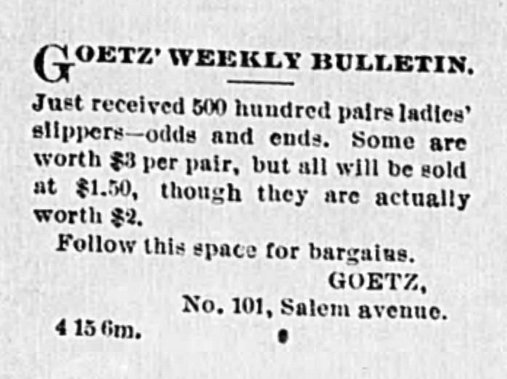 There was a store in Roanoke named Goetz’s around that time. It was there before George Goetz arrived, and was known for its “fine hand-made shoes,” straw hats “in the latest styles,” and clothes for children, ladies, and gents.