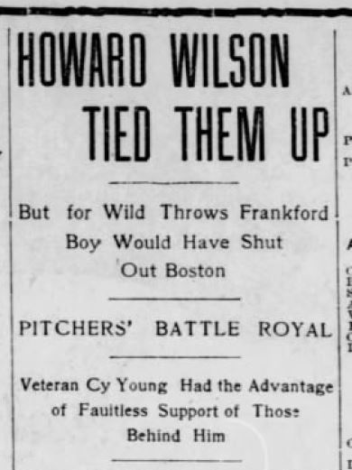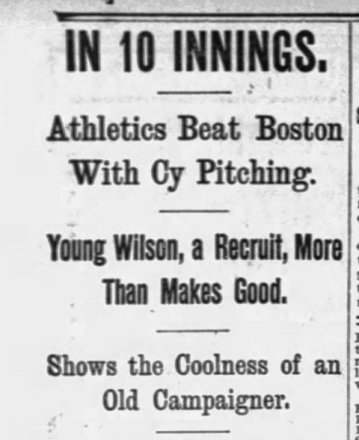 Wilson’s first win as a big league pitcher comes on July 14, 1902, when the Philadelphia A’s defeat the Boston Red Sox 4-3 in 10 innings. Wilson pitches all 10 and is cited for his control and for being calm under pressure.
