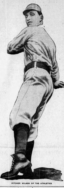 Wilson is small – 5’9”-ish – and injury-prone. When newspapers do mention him – which is seldom – reporters will call him “diminutive,” and note his “glass arm” and bad knees. He is known for being “clever” on the mound, rather than dominating; his pitches are best described as “floaters.” While playing on a Philadelphia YMCA team in 1901, nursing a leg injury, he pitches standing on one leg. (I realize that pitching while standing on one leg should have been noted much earlier, but thank you for reading this far.)