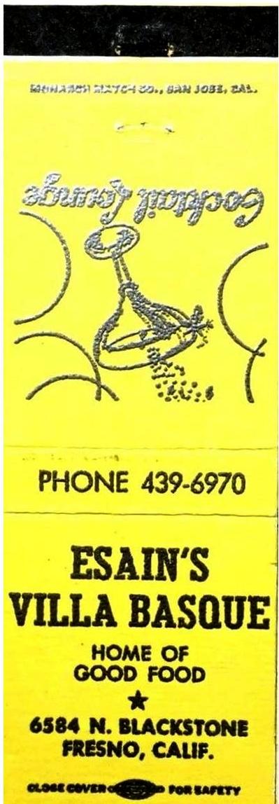 A fire destroyed Esain’s Villa Basque restaurant in Fresno not long after we moved away. It never reopened.