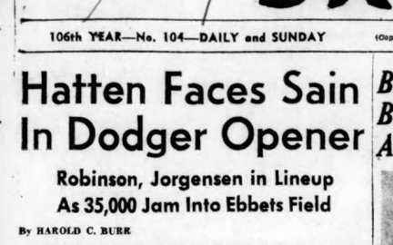 And, it’s sort of sweet that the front page story of that day’s Brooklyn Eagle mentions Robinson – “the first Negro to crash the big league” – only in passing and several paragraphs after the Opening Day weather report. (Ideal Opening Day weather, the Eagle reported. “A bright sun was expected to zoom the thermometer up near the 60-degree mark with gentle, variable winds on the job to keep the sky practically cloudless.”)