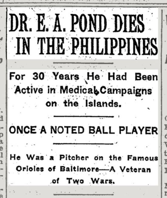 Headline "Dr. E.A. Pond Dies In The Philippines. For 30 Years He Had Been Active In Medical Campaigns on the Islands. Once A Noted Ballplayer. He Was a Pitcher on the Famous Orioles of Baltimore - A Veteran of Two Wars."