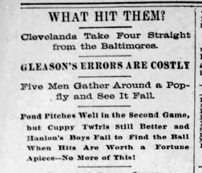Manager Hanlon was impressed with Pond’s outings, telling The Baltimore Sun: “This lad is destined to be a great pitcher. He went in yesterday under the most unfavorable conditions and in spite of the efforts of the Cleveland players and the crowd to rattle him, he kept his nerve well. He has speed, control, and good command, and I consider him a very lucky find.”