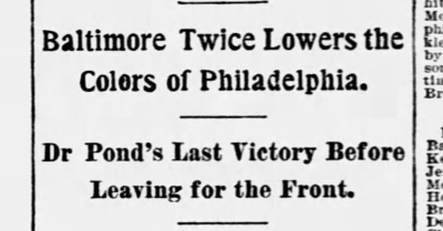Headline: Baltimore Twice Lowers the Colors of Philadelphia. Dr Pond's Last Victory Before Leaving for the Front."