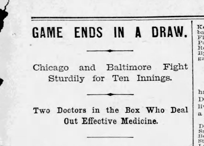 Headline: "Game Ends In A Draw. Chicago and Baltimore Fight Sturdily for Ten Innings. Two Doctors in the Box Who Deal Out Effective Medicine."