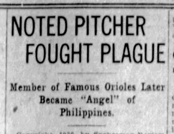 Headline: "Noted Pitcher Fought Plague. Member of Famous Orioles Later Became 'Angel' of Philippines."