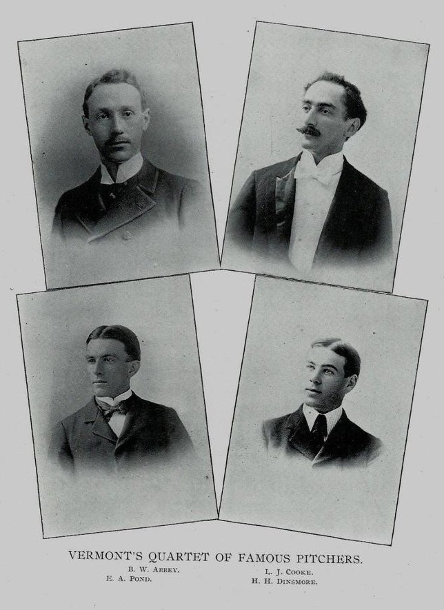 University of Vermont yearbook, 1890s. Four headshots of the team's pitchers nattily dressed in suits. Arlie Pond is bottom left.