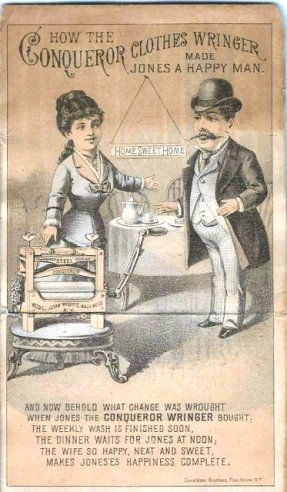 Sure, the clothes wringer made washing day a little less back-breaking, but, as you can see, its biggest benefit was giving the wife time to get dinner on the table in time.