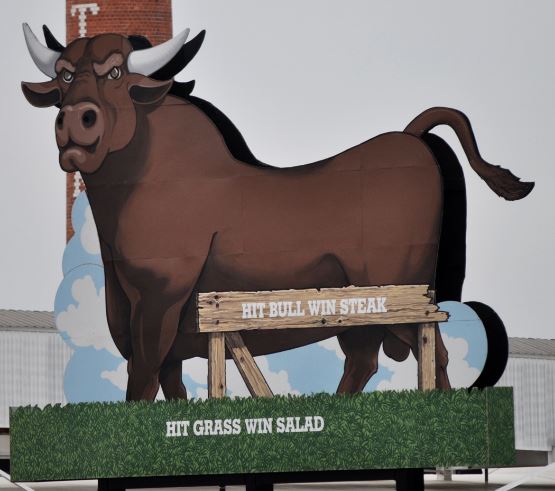 And, yup, a local restaurant provides a steak to players who hit a home run off of the bull. (No word on whether a ball that hits the grass actually earns a trip to the salad bar, or if anyone has ever asked.)