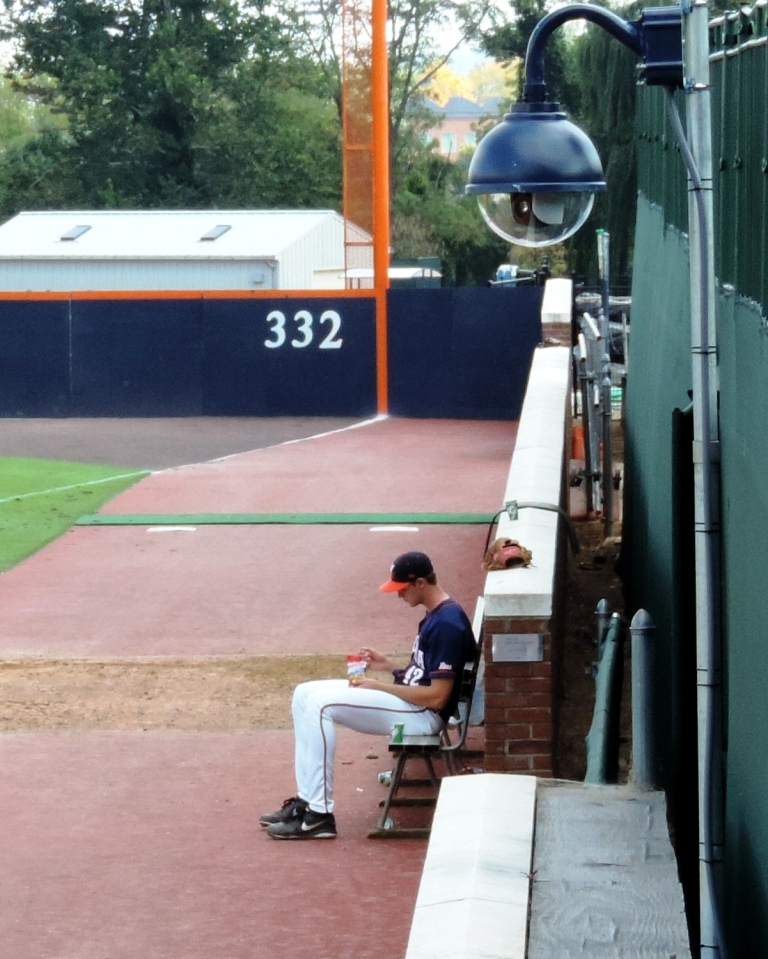 UVA’s Jake McCarthy, Team Orange, considering a steal. UVA’s Justin Novak, Team Blue, waits at short. Or, as Editor/Husband describes the Orange vs. Blue series: “Brother against Brother.”
