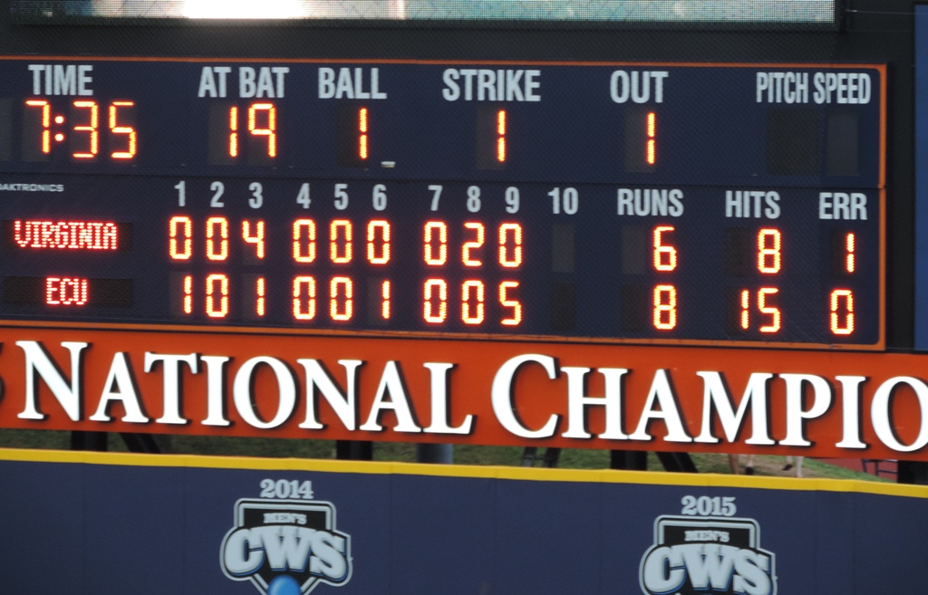 UVa defeated the Canadian squad (an 18-and-under team featuring some of the best young players in the country) 12-5 last night in a strange 14-inning “exhibition” game that was a more a showcase for scouts, I think, than an actual game. Players batting out of order. Pinch runners pinch running and then disappearing. Really odd.